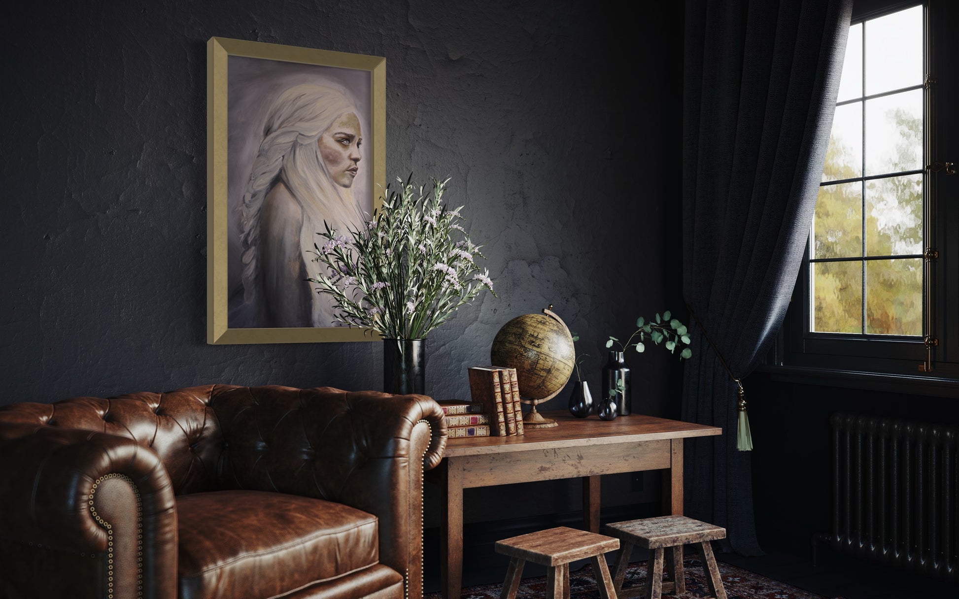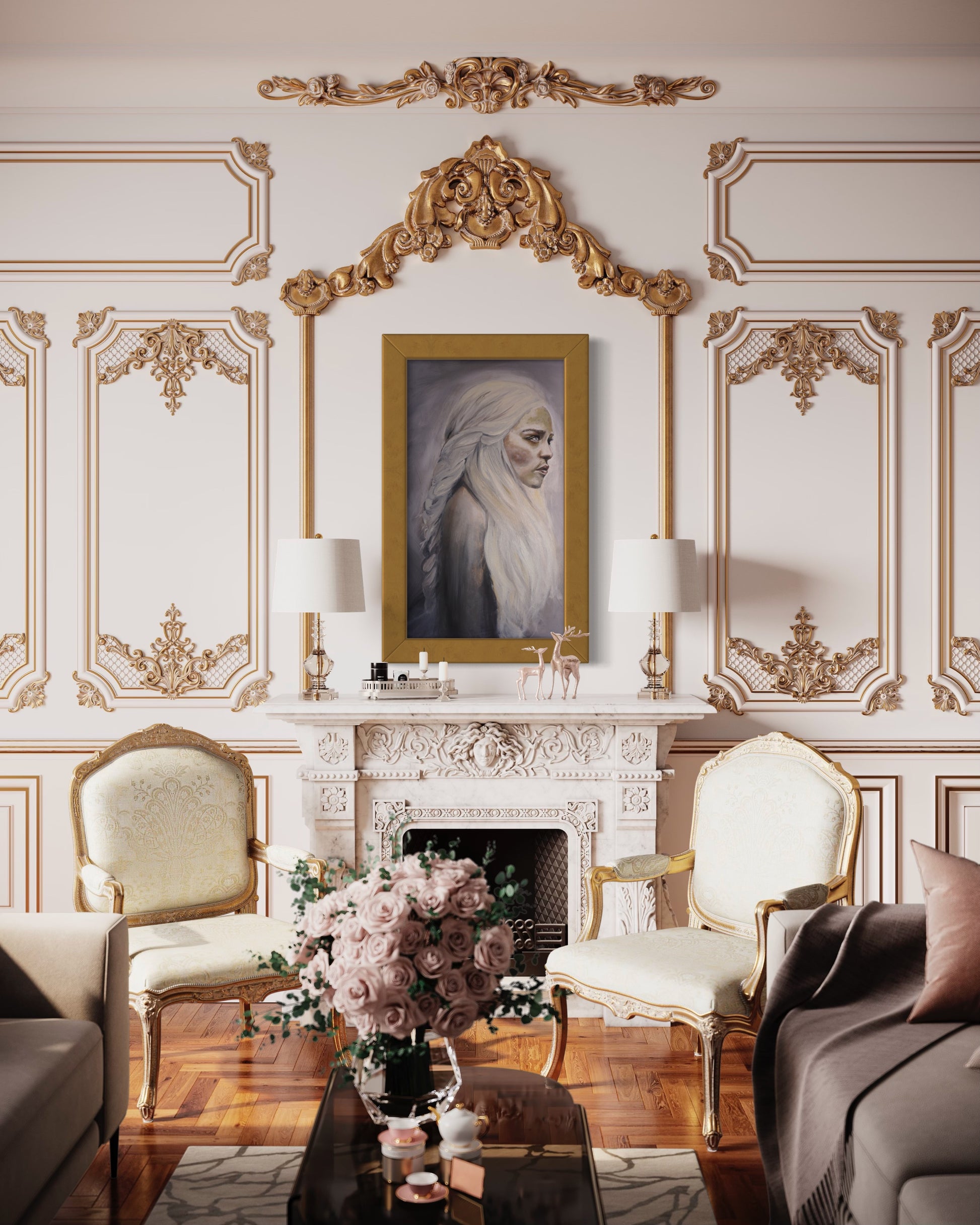 Khaleesi is an experience. She tells a story. Becoming something she never wanted to become. Something she worked hard to make the opposite true. Her emotions, her anger, her rage got the best of her. With faded colours and clouded brushstrokes, she is messy, consumed by her emotions. The lack of colour is chosen to represent her troubles and hardship. She is confused yet confident in herself. She believes she is in fact right in her ways. She believes she won. She triumphs. Whether or not that is reality, what her mind tells her is all that matters.