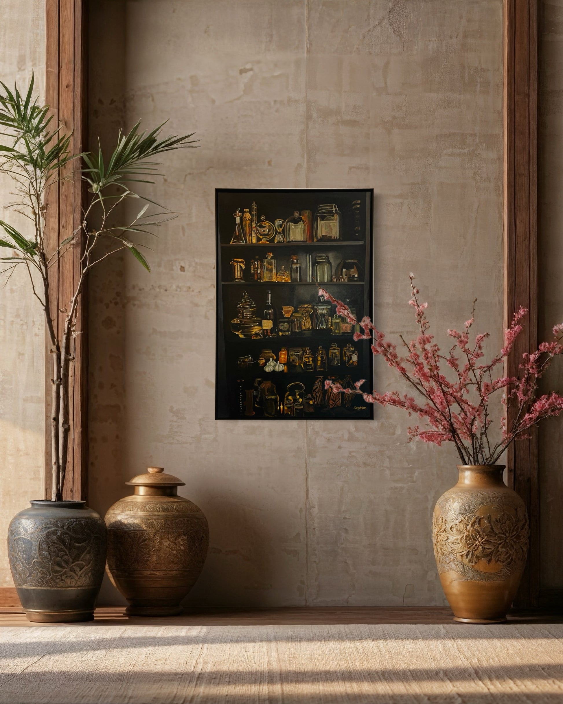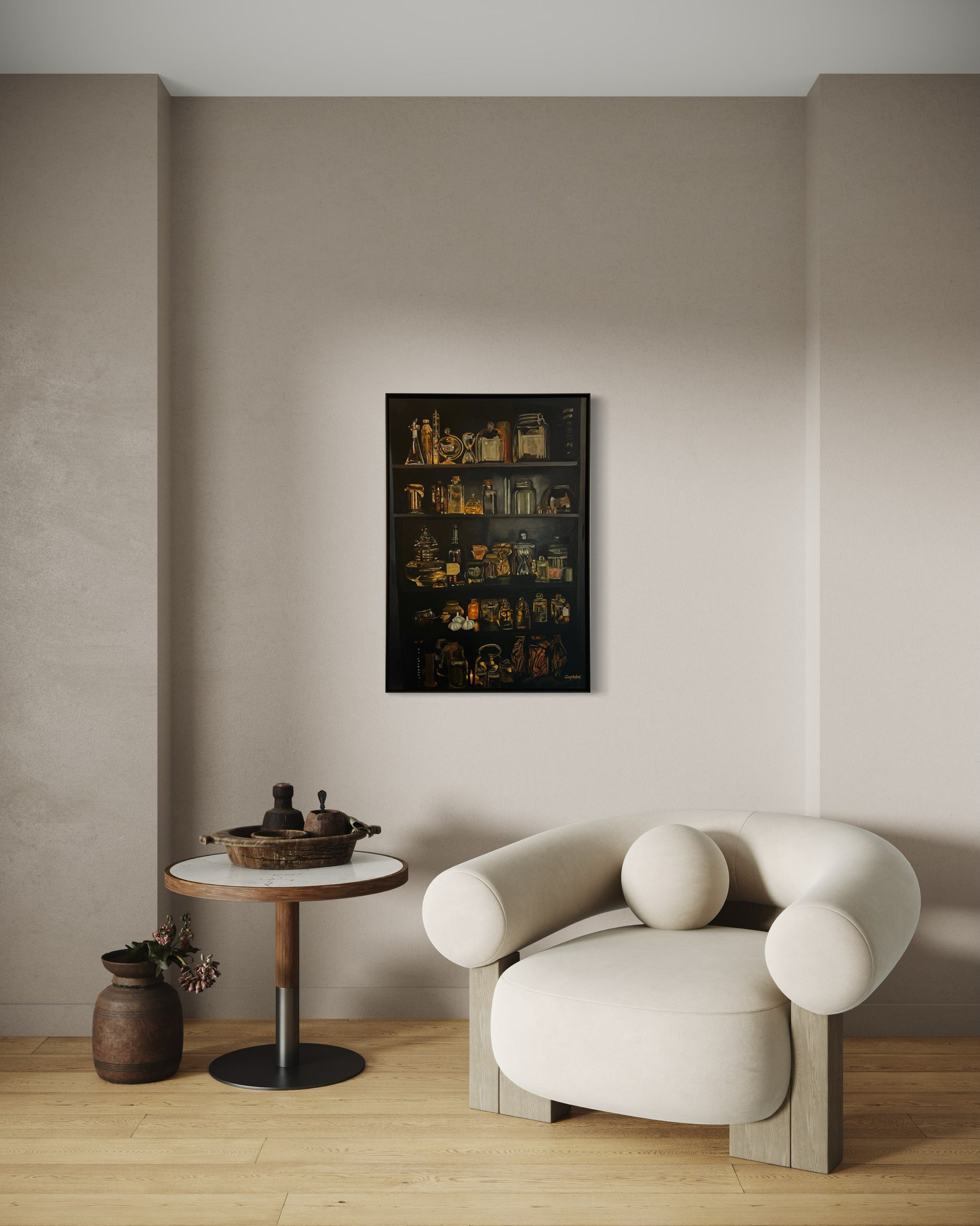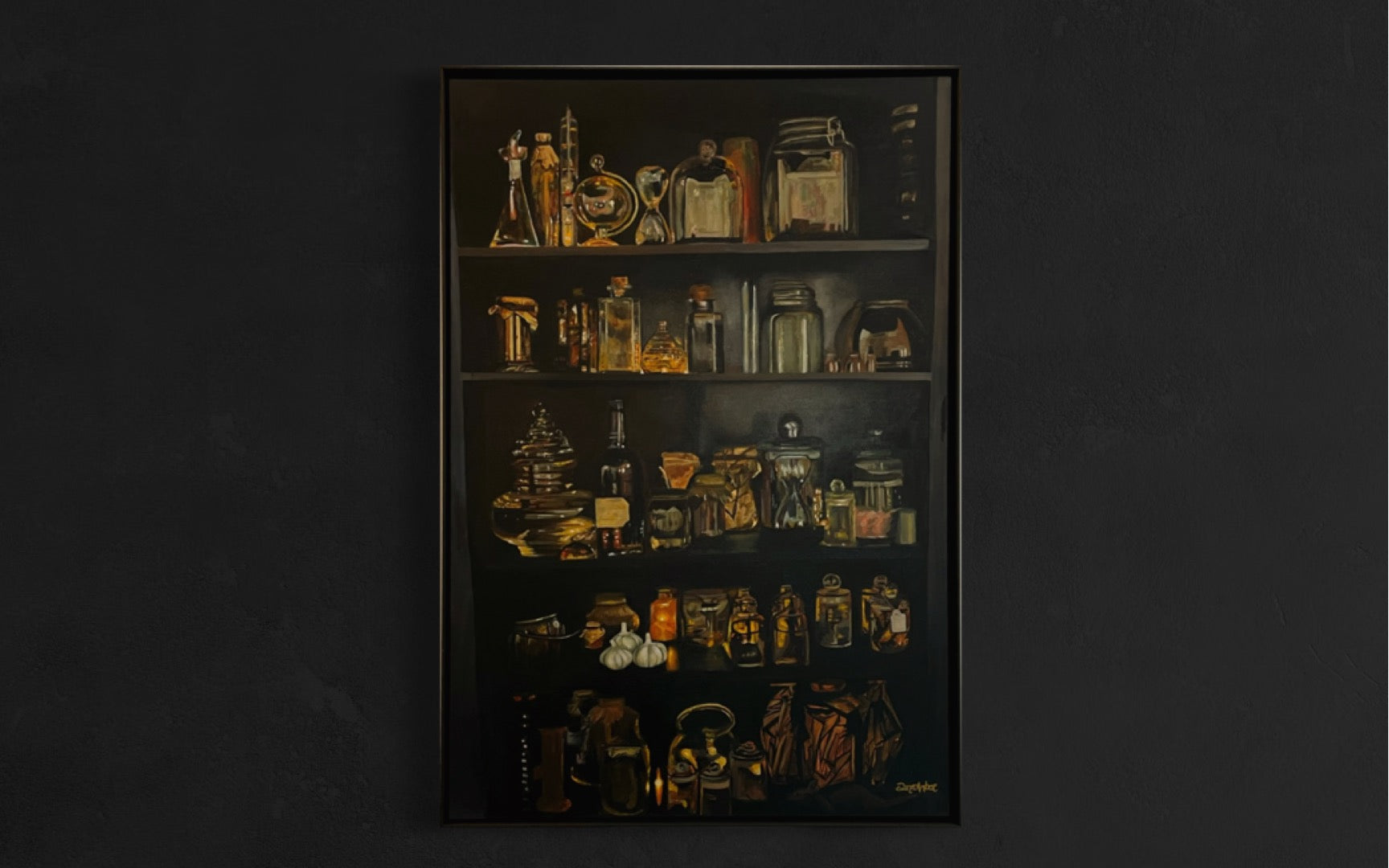 Inspired by Harry Potter, a theme of imagination and longing for a world of fantasy. J.K. Rowling once said “something very magical can happen when you read a good book” and this is exactly the aftermath of that. This painting reflects a vision I saw and recreated it instantly. It was one of those paintings I just knew I had to create, and saw it before the canvas was even bought. Looser brush strokes were used to create the different objects. This painting holds many layers including a layer of sienna, to create the illusion of the warm light behind the objects. I wanted the observer to feel like they have entered a potions room when they look at this. A fantasy world.